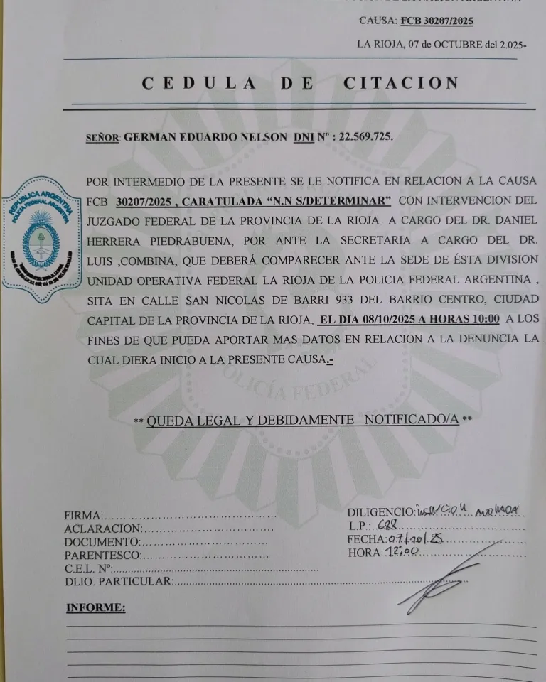 La causa está a cargo del juez federal Daniel Herrera Piedrabuena, quien ordenó la citación del comunicador para que declare sobre la procedencia de la imagen que difundió en sus redes sociales. En la fotografía se identifica al hombre como el presunto secretario de Hacienda de Castro Barros, cuya cabecera es la localidad de Aminga.
