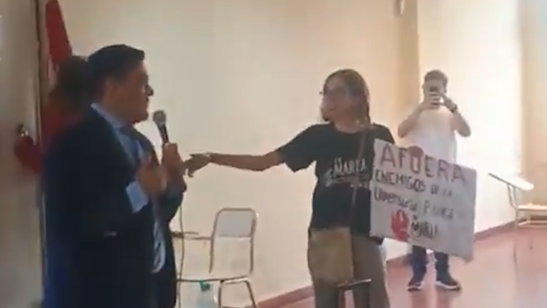 El incidente tuvo lugar durante una charla que se desarrollaba en el marco de una cátedra de Derecho Constitucional. Los invitados a exponer eran el diputado nacional por La Rioja, Gino Visconti, y el senador nacional por la provincia de Chaco, Juan Cruz Godoy.